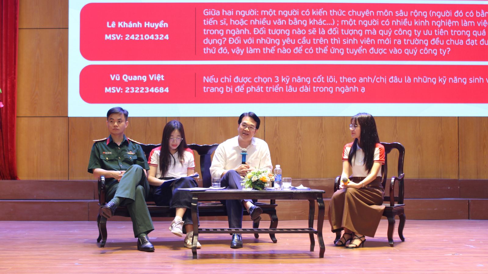 Bên cạnh đó, phần trao đổi, thảo luận trực tiếp giữa sinh viên và doanh nghiệp đã diễn ra sôi nổi, tập trung vào các nội dung thiết thực như yêu cầu về năng lực, kỹ năng cần thiết, cơ hội thăng tiến và những thách thức trong giai đoạn đầu sự nghiệp. Qua đó, sinh viên có thêm góc nhìn toàn diện, thực tế hơn để định hướng con đường nghề nghiệp phù hợp với năng lực và mục tiêu cá nhân.