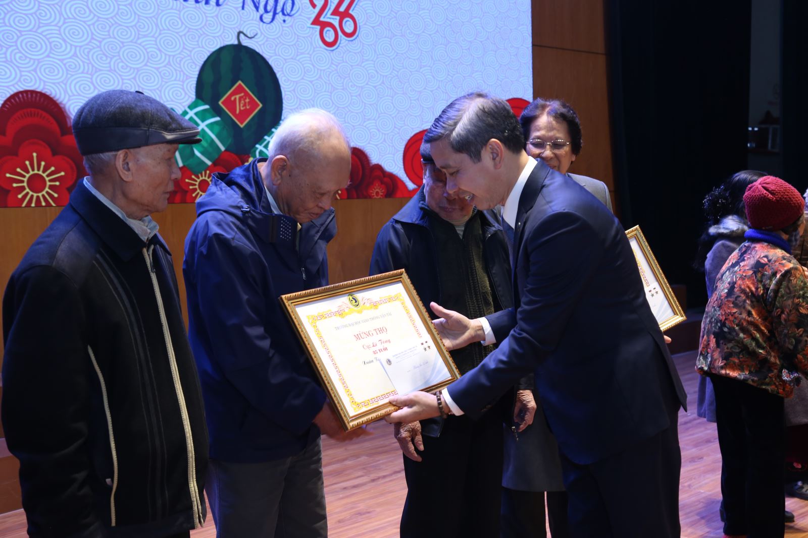 Trong không khí ấm áp của buổi gặp mặt, Nhà trường tổ chức lễ mừng thọ các cụ cán bộ hưu trí, như một lời tri ân sâu sắc đối với các thế hệ đi trước. Năm nay, Nhà trường vinh dự được mừng thọ cho 03 cụ 95 tuổi, 15 cụ 90 tuổi, 13 cụ 85 tuổi, 24 cụ 80 tuổi, 20 cụ 75 tuổi và 06 cụ 70 tuổi.