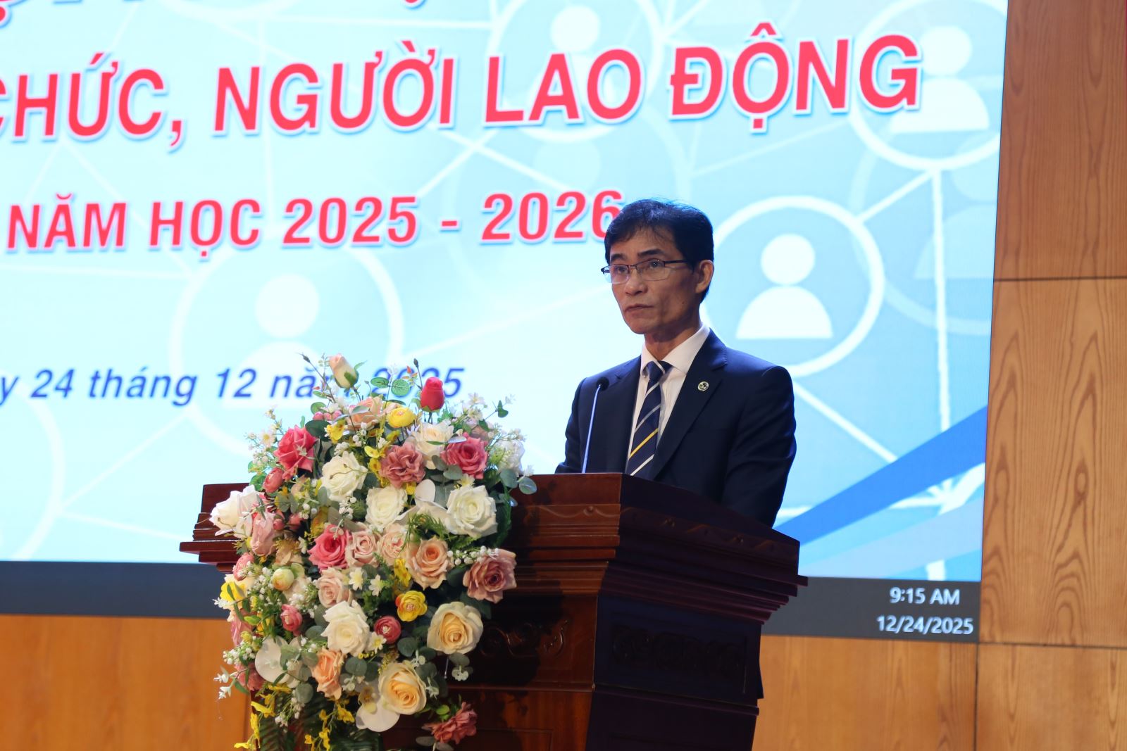 PGS.TS Lê Hoài Đức - Phó Hiệu trưởng trình bày báo cáo tổng kết năm học 2024 - 2025 và phương hướng nhiệm vụ năm học 2025 - 2026