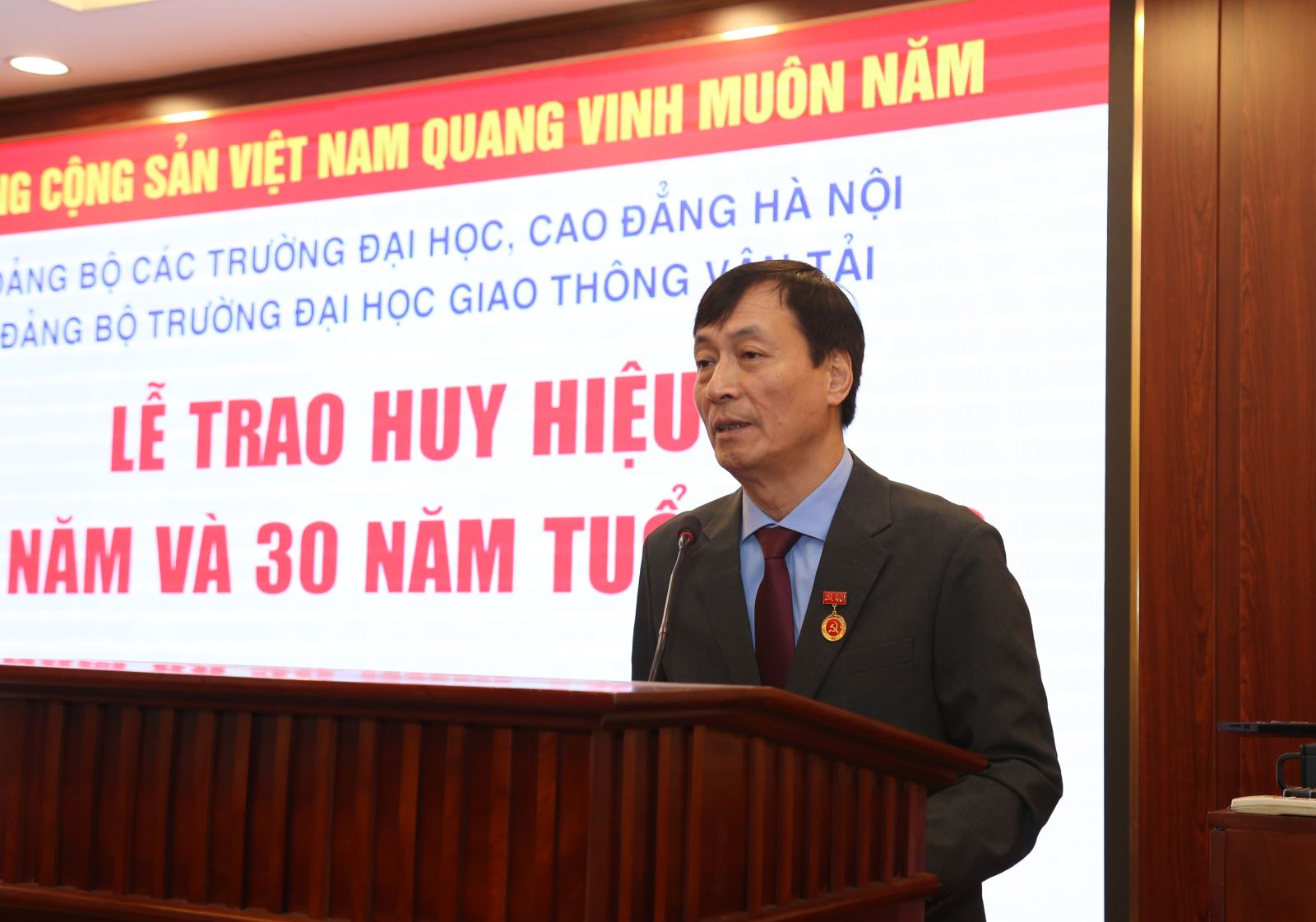 Phát biểu tại buổi lễ đồng chí Nguyễn Thanh Chương – Bí thư Đảng ủy khẳng định Huy hiệu Đảng mà các đồng chí được đón nhận ngày hôm nay là biểu tượng thiêng liêng của lòng trung thành tuyệt đối với lý tưởng của Đảng; là sự ghi nhận của Đảng, Nhà nước và Nhân dân với cả một chặng đường dài phấn đấu, rèn luyện, cống hiến và hi sinh thầm lặng; là minh chứng sinh động cho phẩm chất, bản lĩnh và khí phách của người đảng viên cộng sản Việt Nam qua các thời kỳ lịch sử. Huy hiệu Đảng được trao ghi dấu những tháng năm các đồng chí gắn bó với sự nghiệp cách mạng, với công cuộc xây dựng và bảo vệ Tổ quốc, với sự nghiệp giáo dục và đào tạo, với từng bước đi, từng thành tựu của Trường Đại học Giao thông vận tải. Những đóng góp ấy dù trong thời kỳ nào, giai đoạn phát triển nào cũng đều góp phần tạo dựng nên nền tảng vững chắc để Nhà trường hôm nay có thể tự tin vươn lên, khẳng định vị thế trong khu vực và trên trường quốc tế.