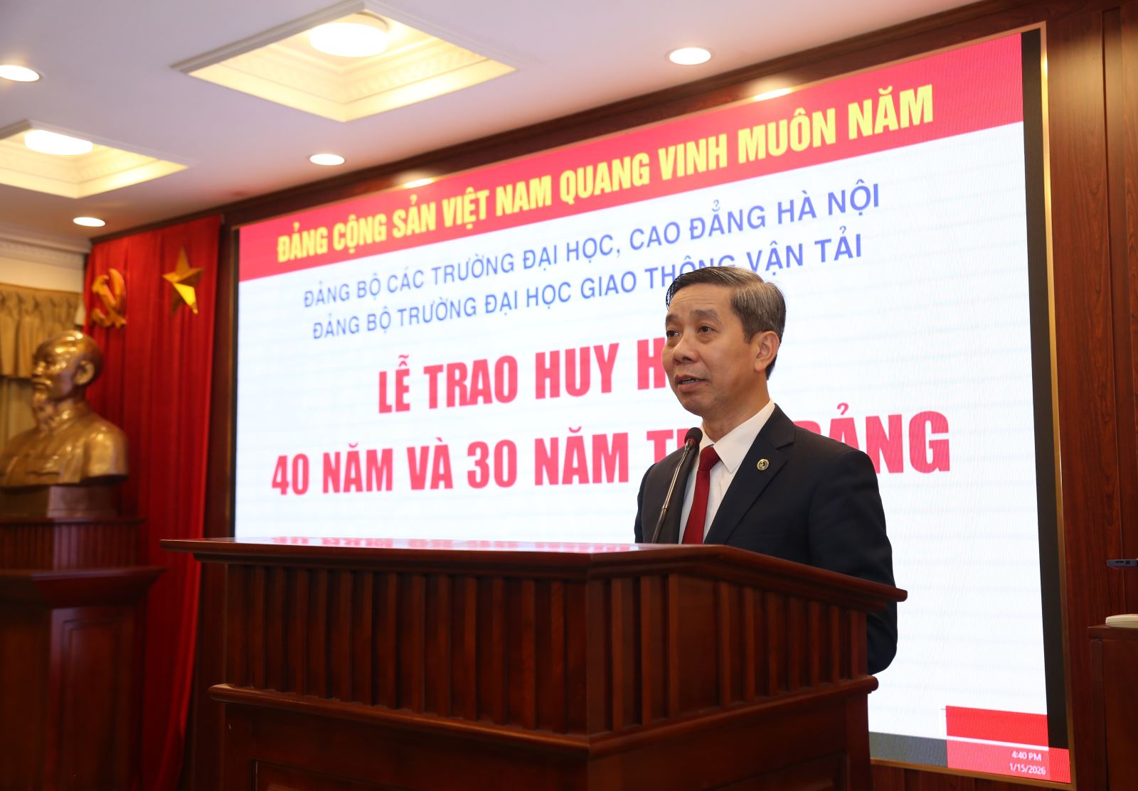 Ngày 15/01/2026, Đảng ủy Trường Đại học Giao thông vận tải đã tổ chức Lễ trao tặng huy hiệu 40 năm, 30 năm tuổi Đảng cho 04 đồng chí đảng viên thuộc Đảng bộ Trường.