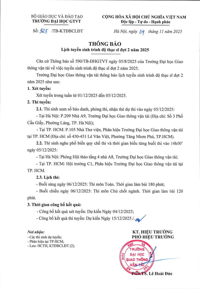 THÔNG BÁO LỊCH TUYỂN SINH TRÌNH ĐỘ THẠC SĨ ĐỢT 2 NĂM 2025 Đính kèm: Lịch tuyển sinh. CH2.2025.925.pdf Đăng bởi: Phòng Khảo thí & ĐBCLĐT