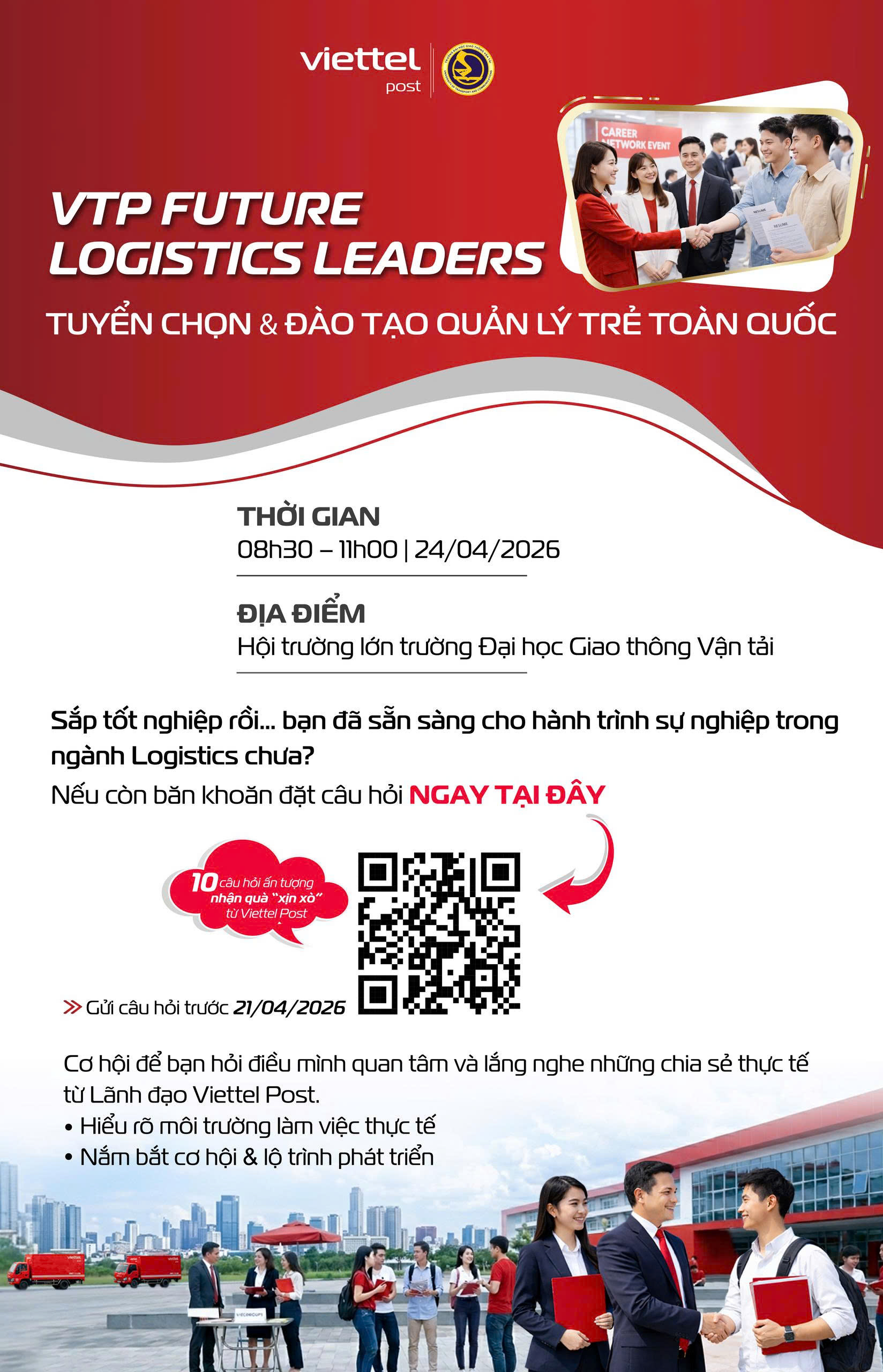 Tiếp nối sự đồng hành giữa Trường Đại học Giao thông Vận tải và Viettel Post, chương trình “VTP Future Logistics Leaders” - Tuyển chọn và Đào tạo Quản lý trẻ quy mô toàn quốc được triển khai nhằm mang đến cơ hội nghề nghiệp và lộ trình phát triển rõ ràng cho sinh viên, đặc biệt là các bạn năm cuối các ngành: Kinh tế vận tải, Khai thác vận tải, Quản trị Logistics, Vận tải thương mại quốc tế; cùng sinh viên quốc tế (Lào, Campuchia) và học viên sau đại học.